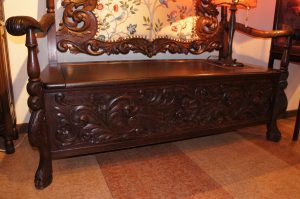 彫刻が素晴らしい長椅子調のベンチを、刺繍仕上げのウィリアムモリスのファブリックで豪華に仕上げました。
